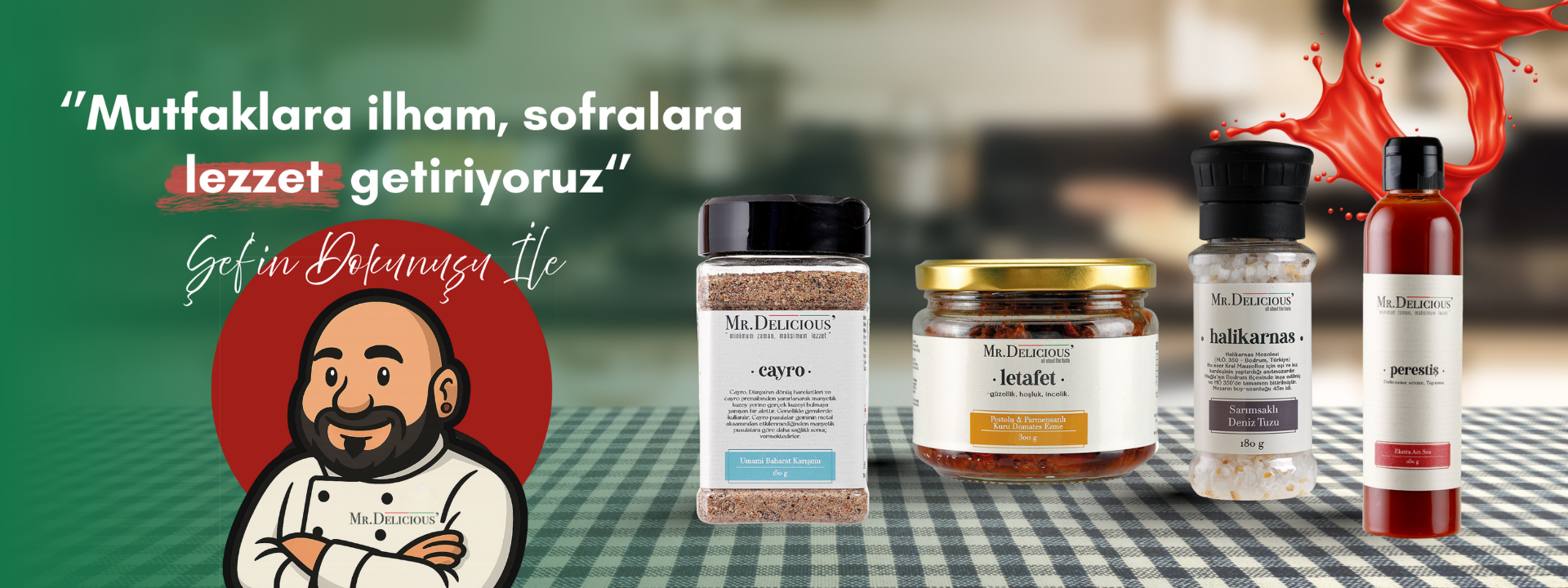 Bizimle her öğün bir şölene, her an bir deneyime dönüşüyor. Rota Oluşturuldu: Lezzetin Doğuşu Mr. Delicious’ Kitchen, modern yaşamın hızlı temposunda lezzetten ödün vermeyenler için hayatı daha kolay ve lezzetli kılma hayaliyle doğdu. Yolculuğumuz, 30 yılı aşan deneyimin üzerine inşa edilen yenilikçi bir vizyonla şekillendi. Amacımız günümüzün hızlı temposuna uygun ürünlerle mutfaklara hem pratik hem de gurme tatlar taşımak ve adeta şef dokunuşu getirebilmek. “Minimum Zaman, Maksimum Lezzet!” felsefemizle, her sofraya eşsiz dengeyi taşımak için bu yolculuktayız. Lezzet Haritamız: Ürün Yelpazesi Ürünlerimiz yalnızca zamandan tasarruf sağlamıyor; aynı zamanda her bir öğün için farklı bir tat deneyimi sunuyor. Ürün yelpazemiz, klasik yemekleri yeniden yorumlayan özgün lezzetlerden oluşuyor. Mr. Delicious’ Lezzet Yelpazesinde bulunan her ürün bir hikaye anlatır.